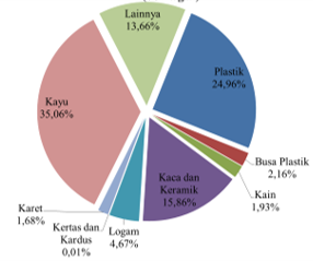 Based on the data collected by MoEF from monitoring in 2017 and 2018 in 18 regencies / cities, it shows that the composition of meso-sized marine litter (0.5-2.5 cm) is dominated by wood (35.06%), plastic (24.96%), glass and ceramics (15.86%), other materials (13.66%), metal (4.67%), plastic foam (2.16%), fabrics (1.93%), rubber (1.68%) ), paper and cardboard (0.01%).