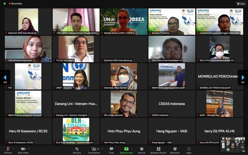 Monitoring of marine and riverine plastic litter is a critical part of assessing the extent and possible impact within, devising possible mitigation methods to reduce inputs, and evaluating the effectiveness of such measures. Based on the importance toward achieving plastic waste reduction, the Center for Southeast Asian Studies (CSEAS) Indonesia in cooperation with the Ministry of Environment and Forestry of the Republic of Indonesia, under the ASEANO (ASEAN-Norwegian Cooperation Project on Local Capacity Building for Reducing Plastic Pollution in the ASEAN Region), has carried out a Regional workshop with the theme Monitoring of Marine and Riverine Plastic Pollution in the ASEAN Region. This activity was carried out virtually via zoom and youtube live streaming on August 23-24, 2021, which was attended by Kakuko Nagatani Yoshida (UNEP), Florence Descroi Comanducci (Director of IAEA Environmental Laboratories), Noir Primadona Purba (ASEANO Project Research Team), Dr. Hidayat (ASEANO Project Research Team), Dr. Marianne Olsen (NIVA), Britta Denise Hardesty (CSIRO), Dr. I Gede Hendrawan (Lecturer of Udaana Uniersity)and related stakeholders. To enhance the capacity of ASEAN Member State officers in conducting marine and riverine monitoring to prevent plastic entering the ocean. This is also a part of the Norwegian - ASEAN Regional Integration Program (NARIP) which aims to foster collaboration in the ASEAN region to reduce plastic pollution, disseminate and share knowledge between countries, and contribute to meeting sound reduction targets both in national and regional scale. this outputs is to sharing and compiling information about marine and riverine plastic monitoring methods.
